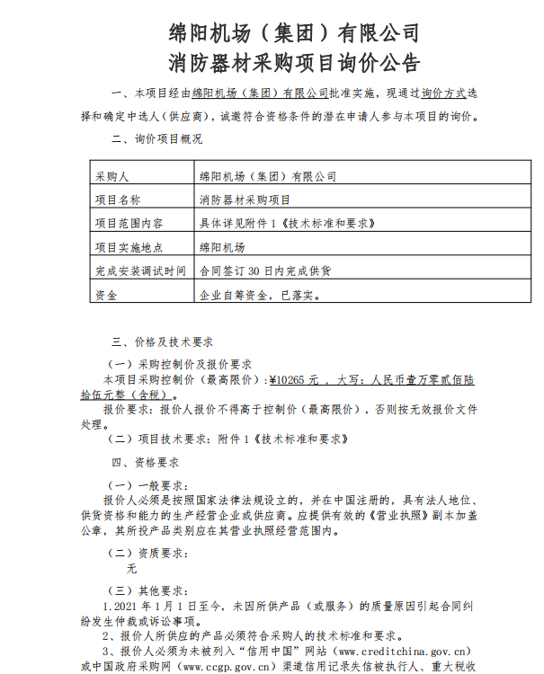 綿陽機(jī)場(集團(tuán))有限公司 消防器材采購項(xiàng)目詢價(jià)公告