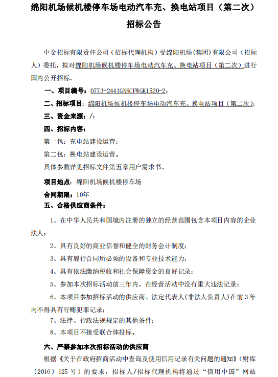 綿陽機(jī)場候機(jī)樓停車場電動汽車充、換電站項(xiàng)目(第二次)招標(biāo)公告