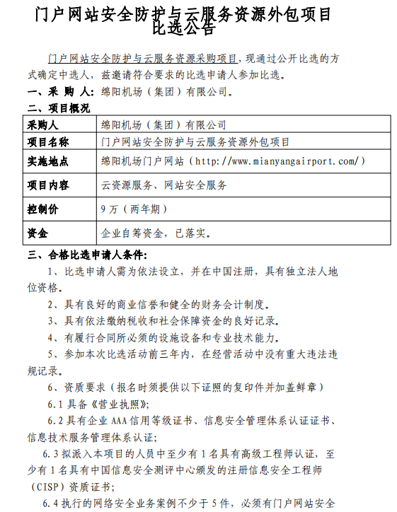 門(mén)戶(hù)網(wǎng)站安全防護(hù)與云服務(wù)資源外包項(xiàng)目比選公告